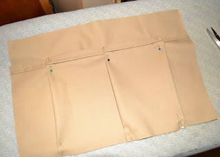 3. Place front piece on back piece. Keep the previously sewn edge up (right sides together). Line up the two side edges and pin in place. Create three little pleats and pin in place at the top and bottom. One should be in the middle and the other two half way from middle to the edge.
