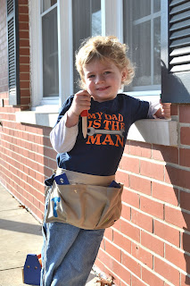 This little man's tool pouch has been a popular item at our house lately. I made up the first one when one of the little guys in my preschool class began carrying all the tools from the playroom in his pockets. Front pockets, back pockets, he even unzipped his pants and was carrying them in his fly. I said, "He needs a tool belt." He now runs for the tool belt first thing. No more need for any pant unzipping. Crisis averted.